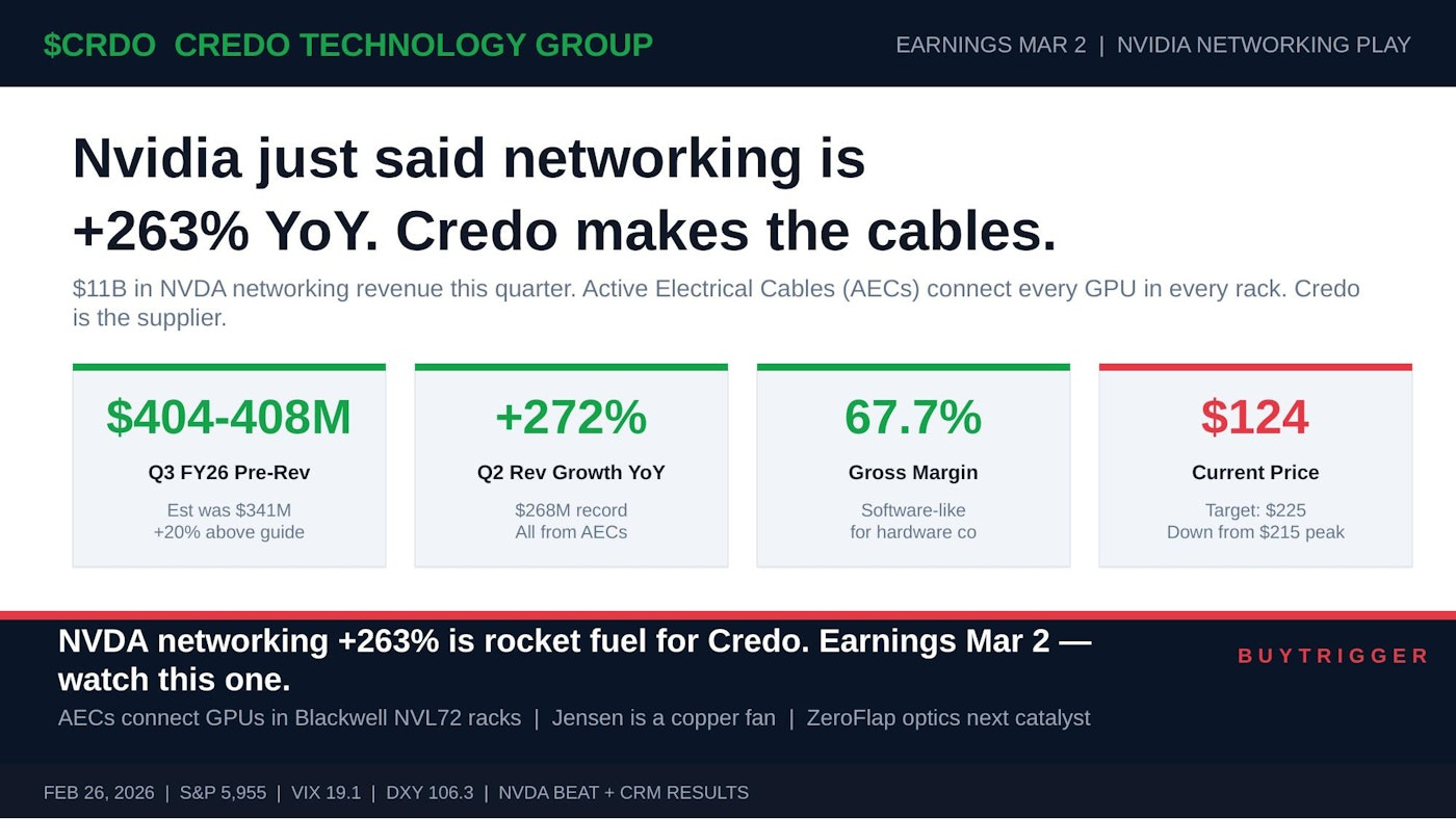 Networking revenue hit $11 billion this quarter. That’s 263% growth year-on-year. NVLink 76, Spectrum-X — these are names you’re going to hear more and more. And this matters because it connects directly to $CRDO (Credo Technology), which I own and which reports earnings on March 2nd.