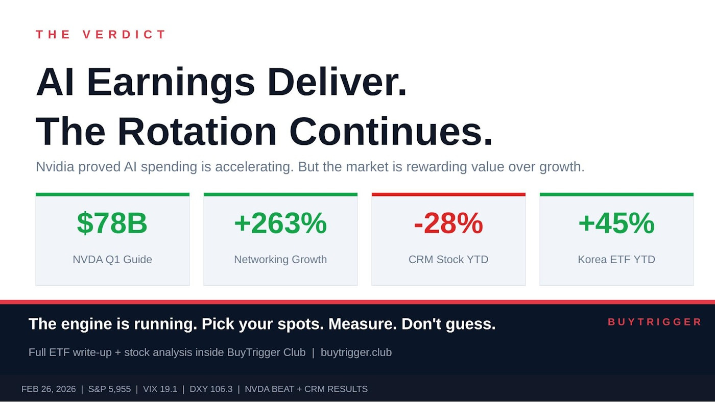 AI earnings have delivered. $NVDA printed $68 billion and guided $78 billion. The networking segment is exploding at 263%. Sovereign AI is an entirely new market forming in real time. The capex cycle is not slowing — $700 billion from the top hyperscalers this year alone, with $194 billion flowing directly to NVIDIA.