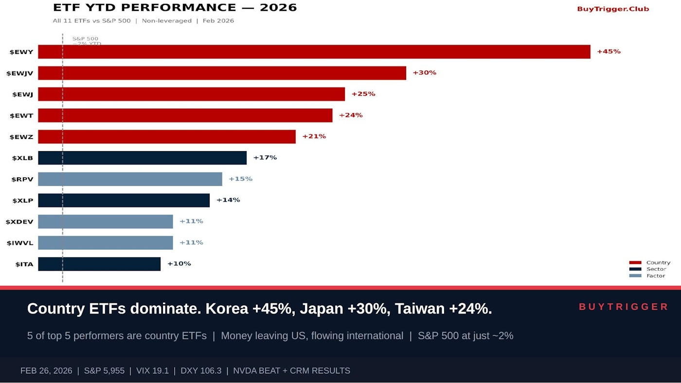 The numbers tell a clear story. Korean ETF (EWY)isup45EWY)isup45EWT) up 24%. Brazil ($EWZ) up 18%. Meanwhile, the S&P 500 is barely positive and NASDAQ is slightly negative.